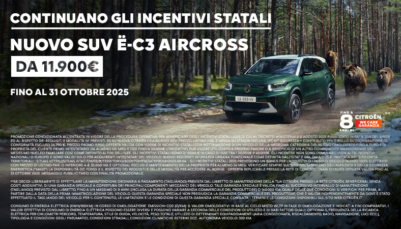 Vieni presso i concessionari Citroen per verificare se puoi accedere agli incentivi statali e come.